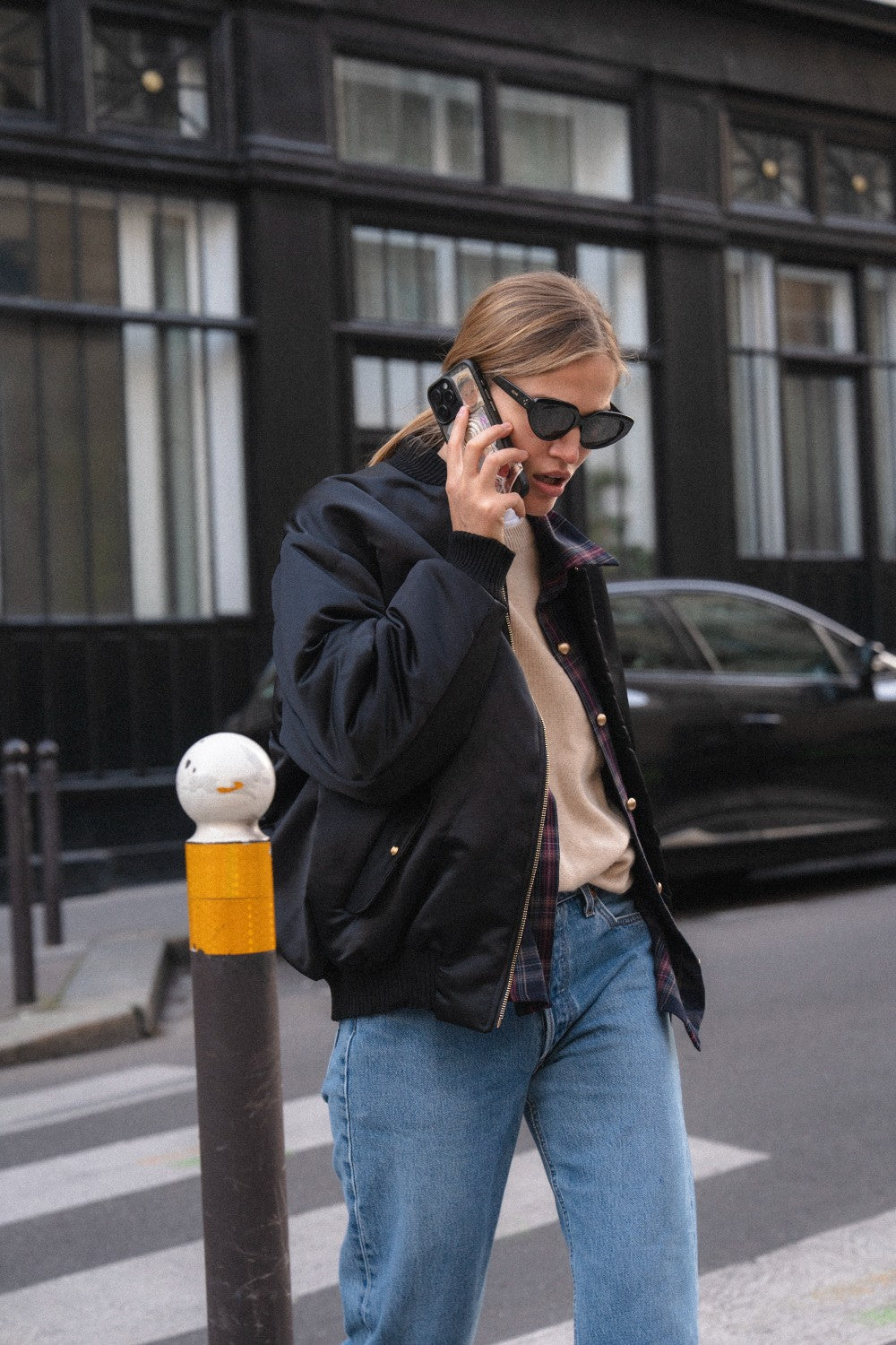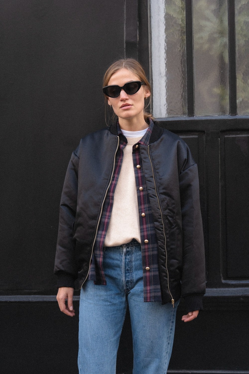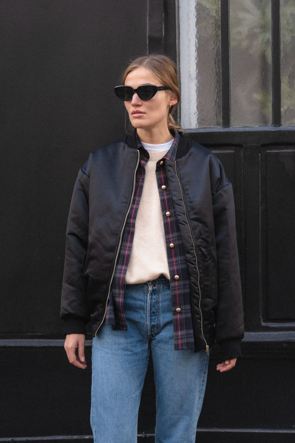 Bombers loose au fini satiné, à la silhouette sportive chic. Johnny possède un col style baseball côtelé ainsi que des poignets et le bas côtélés. Deux poches latérales à rabat avec boutons pressions coquillages dorés sont présentes sur le devant. La veste se ferme à l'aide d'un zip métallique doré. De plus elle est entièrement doublée.
