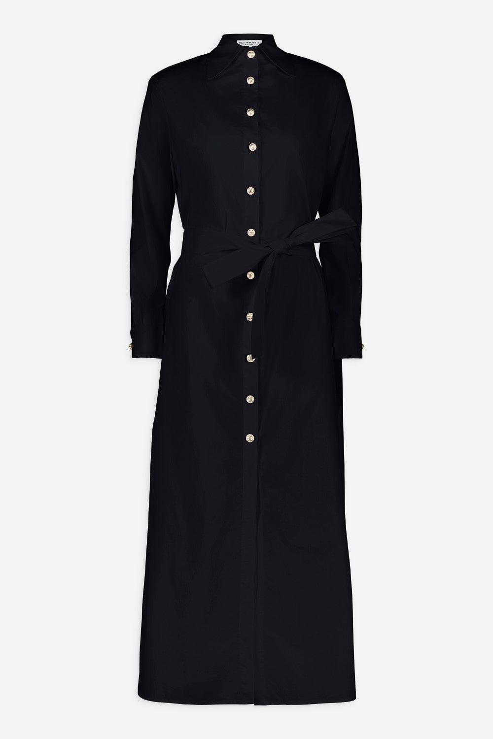 La robe Chacha présente un col classique agrémenté de mini-boutons coquillage tout du long, des manches longues et une ceinture à nouer.
