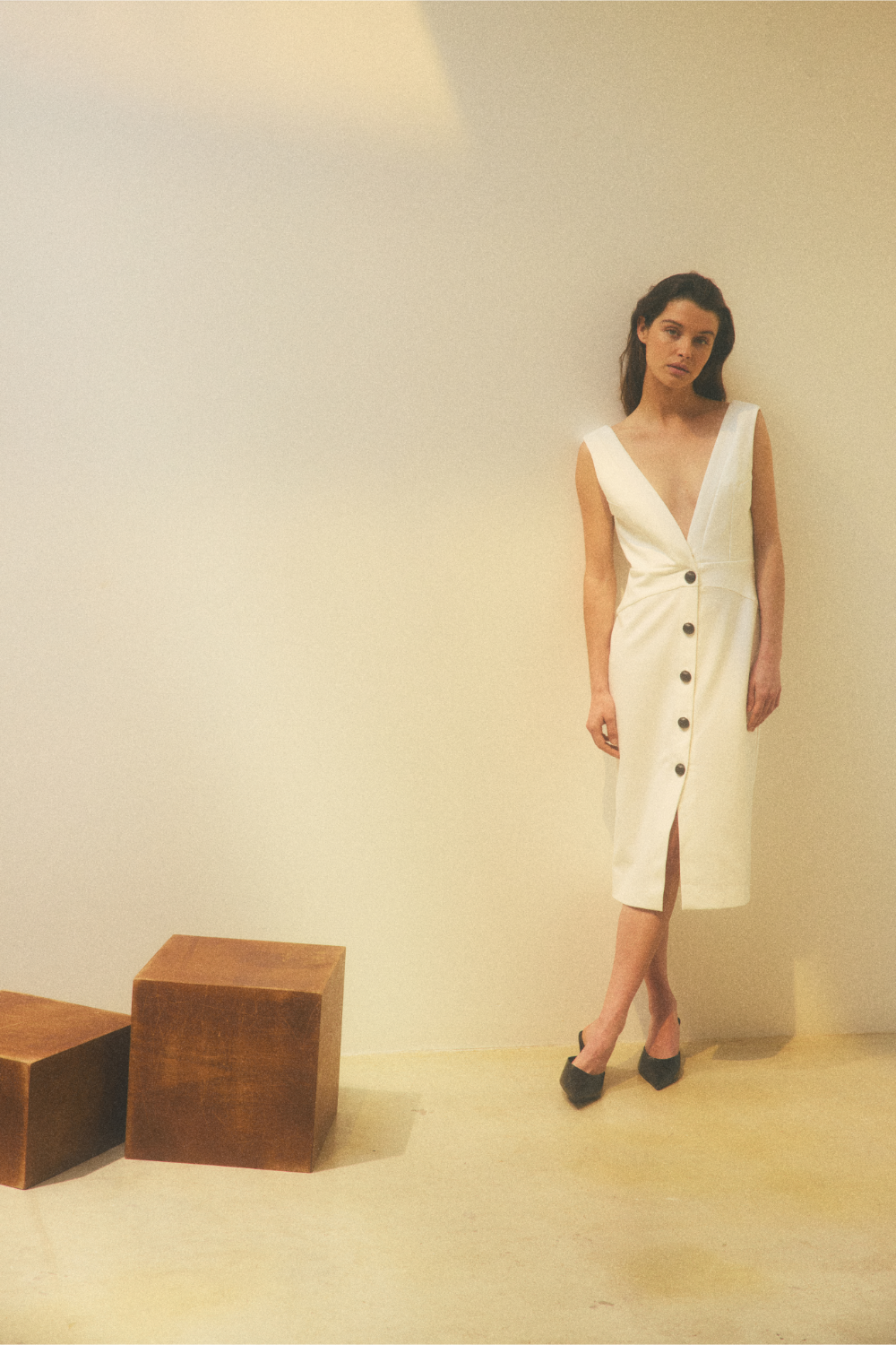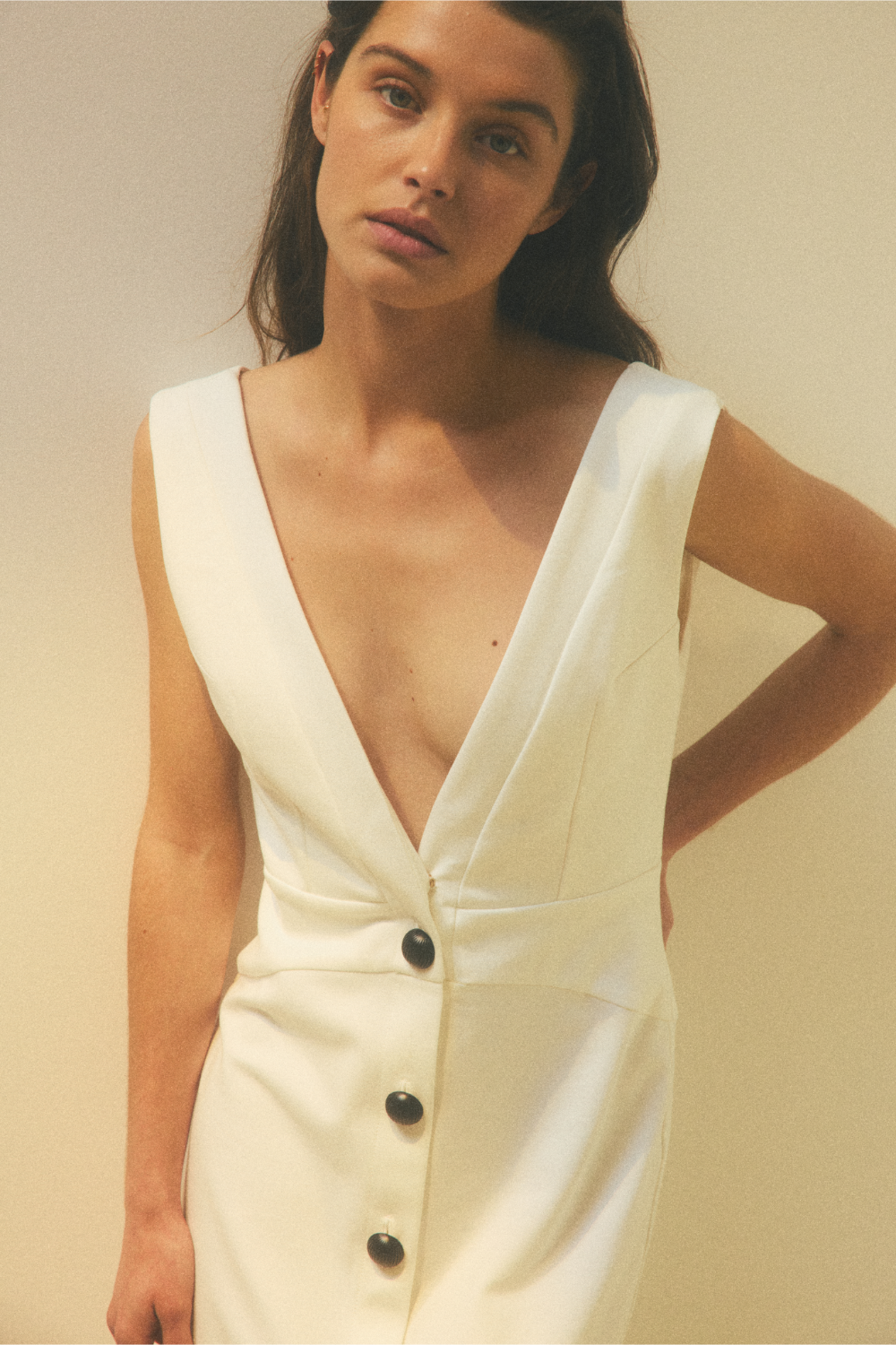 Sleeveless midi dress with a fitted cut, it features a structured plunging neckline and a subtly defined waist for an asymmetrical cut. Its full-length black buttoning adds a touch of elegance and refinement.