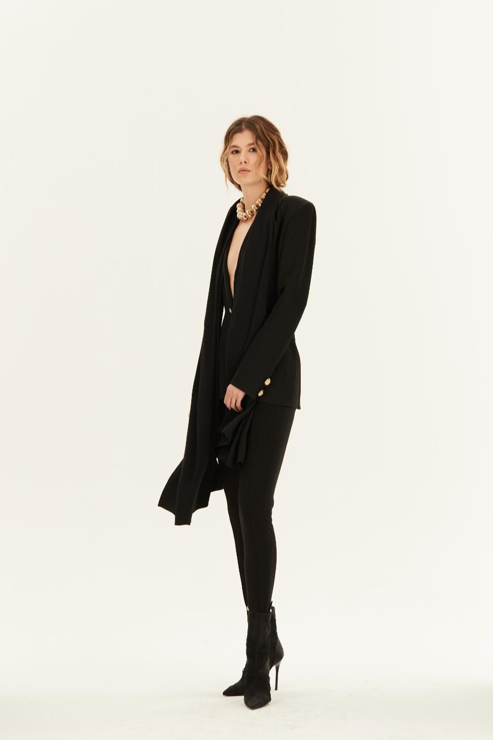 Veste sans col à la coupe ajustée et aux épaules marquées. La Aurélie se ferme à l'aide d'un bouton coquillage doré, deux autres ornent également le bas de chaque manche. Elle possède deux poches passepoilées et est entièrement doublée. L'écharpe intégrée de cette veste permet un éventail de possibilités: elle peut se porter comme un châle, une écharpe ou en guise de capuche.